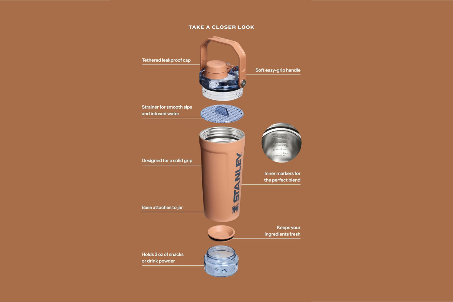 The integrated 3 oz Tritan™ base container lets you store protein powder, snacks, or supplements, so you're always ready no extra containers needed.